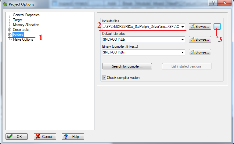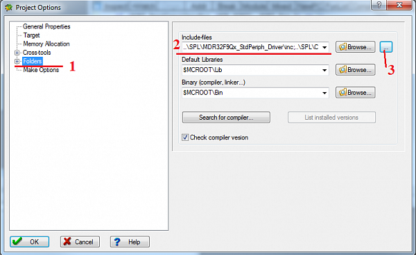 Чтобы среда CodeMaster-ARM могла находить файлы SPL в такой раскладке, необходимо указать ей пути для поиска при сборке. Для этого нужно выбрать пункт «Project – Options», и в открывшемся окне выбрать вкладку «Folders». В строке «Include-files» нужно через запятую прописать относительные пути для файлов библиотеки.