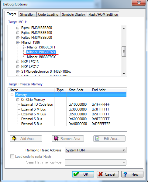 После создания проекта выполним некоторые настройки. Переходим в Debug→ Debug Options, и на вкладке Target нужно выбрать используемый микроконтроллер. В данной статье это К1986ВЕ92.