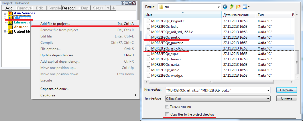 Теперь необходимо подключить к проекту библиотечные файлы для работы с периферией. В данном проекте для работы со светодиодами через порты GPIO (общие порты ввода-вывода) понадобятся функции задания тактирования и работы с портами. Для этого нужно нажать правой кнопкой мыши на папку «C Sources» и в появившемся контекстном меню выбрать пункт «Add file to project…». В открывшемся окне перейти в добавленную ранее папку SPL, и далее по адресу «…\MDR32F9Qx_StdPeriph_Driver\src» выбрать файлы MDR32F9Qx_port.c и MDR32F9Qx_rst_clk.c. Здесь также предусмотрена опция копировать добавляемые файлы в директорию проекта. В данном проекте не используется такой стиль структурирования, поэтому стоит убрать галочку внизу окна с пункта «Copy files to the project directory».