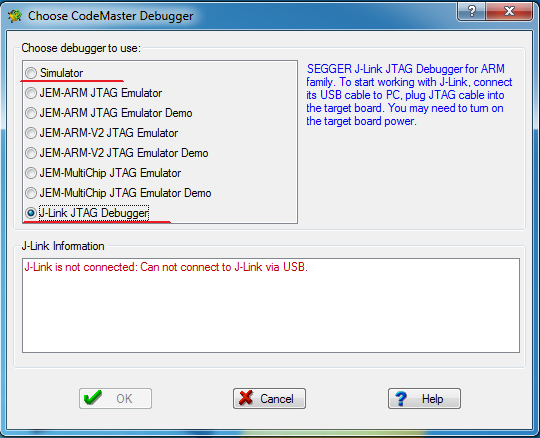 Следующим шагом нам нужно выбрать программатор. Для этого нужно перейти в Debug→ Choose debugger. Режим Simulator - это симулятор системы команд CodeMaster - программно-логическая модель ядра микроконтроллера ARM. При этом периферийные устройства не симулируются. В этом окне нужно выбрать используемый режим, в данном случае - режим J-Link JTAG Debugger. Однако его можно выбрать только при подключенном к компьютеру программаторе. Если программатор не подключен, то в этом случае следует выбрать режим Simulator.