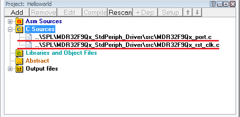 После нажатия кнопки «Открыть» в окне проекта в папке «C Sources» должны появиться файлы MDR32F9Qx_port.c и MDR32F9Qx_rst_clk.c.