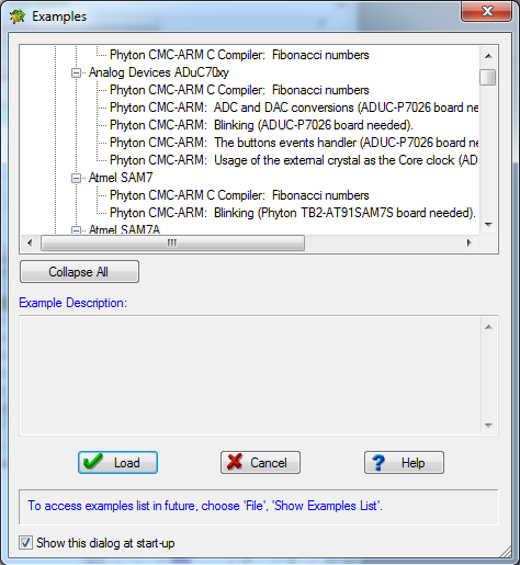 Скачать архив среды можно с сайта фирмы Фитон в разделе загрузке во вкладке ARM & Cortex. В статье используется демо-версия этой программы, которая имеет ограничение по размеру кода 8192 байта, что достаточно для реализации проекта "HelloWorld". После распаковки архива и его инсталляции, при первом запуске среды будет предложено выбрать один из готовых уже проектов. Поскольку создается свой новый проект, данное окно можно закрывать.