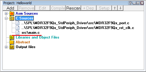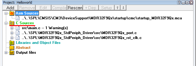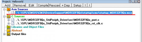 Теперь таким же образом нужно добавить Startup файл, но уже в папку "Asm Source". Для микроконтроллера К1986ВЕ92 startup расположен по пути: …\SPL\CMSIS\CM3\DeviceSupport\MDR32F9Qx\startup\cmc - файл startup_MDR32F9Qx.mca.