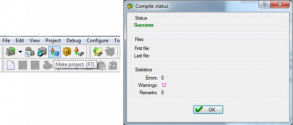 Теперь всё готово к запуску. Для компиляции проекта нужно нажать на соответствующую кнопку в тулбаре, нажать клавишу F7, либо через меню «Project – Make».