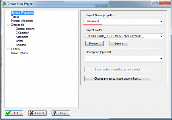 Для создания нового проекта нужно перейти в вкладку Project→New. В открывшемся окне в разделе General Properties необходимо указать Project Name и Project Folder.