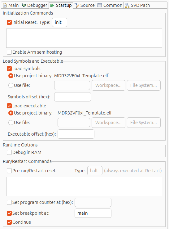 Примечание: В приложенных проектах созданы готовые для использования шаблоны файлов конфигурации (см. "Использование предварительно сохраненных файлов отладочных конфигураций"). Приведенные в текущем пункте настройки нужны для создания новых или модификации имеющихся отладочных конфигураций.