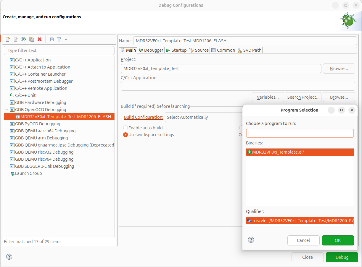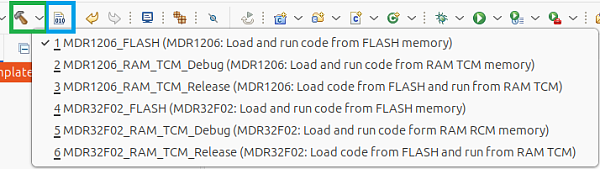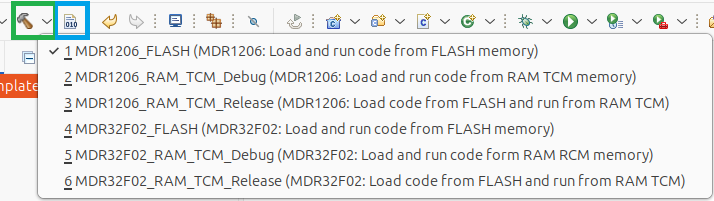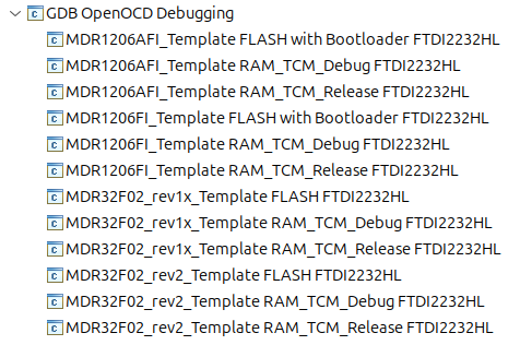 Для частных проектов под конкретный МК неиспользуемые конфигурации сборки убраны - например, из MDR1206_Template удалены конфигурации сборки для MDR32F02 (К1986ВК025), а из MDR32F02_Template убраны конфигурации сборки для MDR1206FI и MDR1206AFI.5. Создание и настройка конфигурации отладки