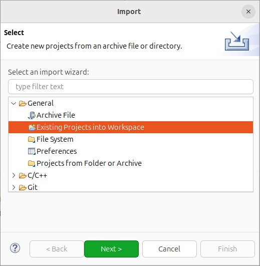 Чтобы добавить проект в Workspace, необходимо выполнить процедуру импорта проекта. Для этого требуется выбрать "File->Import". В открывшемся окне выбрать "General->Existing Projects into Workspace" и нажать "Next >", как показано на рисунке 4.