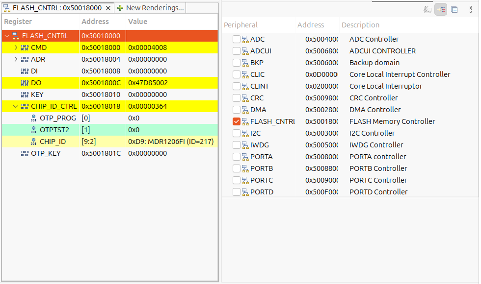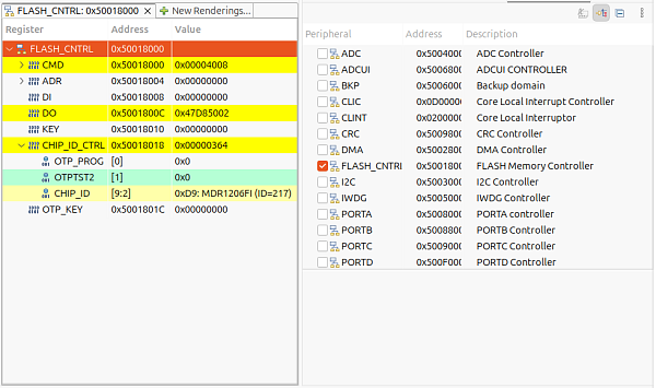 Поле CHIP_ID для определения микросхемы MDR1206FI или MDR1206AFI может быть прочитано в режиме отладки с помощью файла периферии SVD в окне "Memory". Для этого достаточно запустить любую отладочную конфигурацию RAM_TCM_Debug - при отладке только в ОЗУ различия в алгоритме программирования не влияют на возможность запуска отладки, поскольку механизм доступа к памяти ОЗУ одинаков, и используемый SVD-файл также не влияет, поскольку регистр FLASH_CNTRL->CHIP_ID_CTRL расположен по одинаковым адресам в MDR1206FI и MDR1206AFI. После перехода в отладку через окно Memory необходимо открыть просмотр регистров блока RST_CLK и установить в "1" бит PCLK[3] – FLASH в регистре RST_CLK->PER2_CLOCK для дальнейшего доступа к регистрам блока FLASH_CNTRL. Затем открыть регистры FLASH_CNTRL. В регистре FLASH_CNTRL->CHIP_ID_CTRL поле CHIP_ID указывает на версию микросхемы - значение 215 соответствует MDR1206AFI, значение 217 соответствует MDR1206FI (рисунок 18).