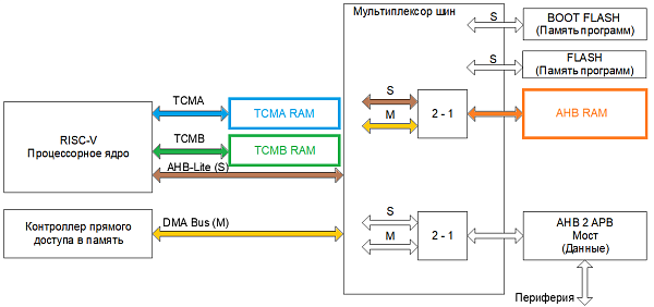 МК MDR1206FI, MDR1206AFI имеют три области ОЗУ: TCMA RAM, TCMB RAM и AHB RAM. Ядро имеет доступ ко всем трём областям ОЗУ, контроллер DMA получает доступ к памяти TCM RAM по шине AHB-Lite (рисунок 19) через арбитр доступа к блокам памяти TCM в ядре.