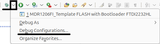После сборки проекта для создания конфигурации отладки необходимо нажать на стрелку у значка "жука" и выбрать пункт "Debug Configurations…", рисунок 11.