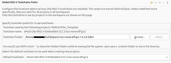 Во вкладке "MCU->Global RISC-V Toolchains Paths", необходимо выбрать toolchain по умолчанию "xPack GNU RISC-V Embedded GCC (riscv-none-elf-gcc)" и прописать путь к папке bin GNU RISC-V (xPack GNU RISC-V Embedded GCC), рисунок 3.