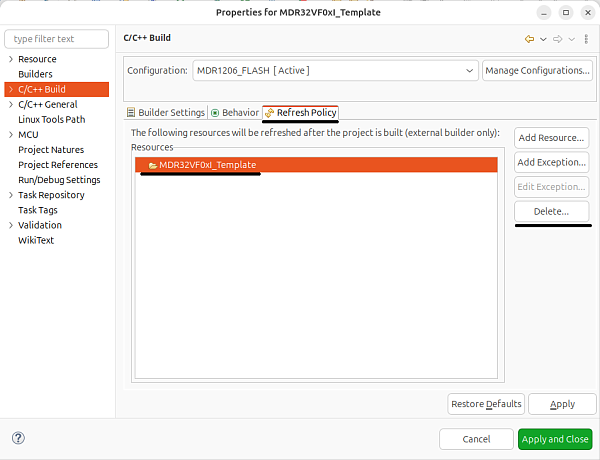 Добавленный проект можно переименовать. Для это следует нажать ПКМ на имя проекта и выбрать пункт "Rename" (или нажать F2). После переименования следует изменить папку ресурсов. Для этого необходимо перейти в свойства проекта (ПКМ на имя проекта -> Properties или нажать "Alt+Enter"). В открывшемся окне необходимо перейти в "C/C++ Build -> Refresh Policy" и удалить папку со старым названием проекта, как показано на рисунке 7. Следует учитывать, что переименование проекта вызовет необходимость изменения предварительно сохраненных конфигураций отладки (см. Использование предварительно сохраненных файлов отладочных конфигураций).