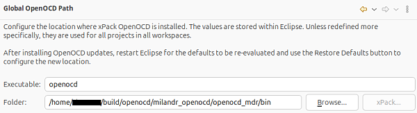 Во вкладке "MCU->Global OpenOCD Path" необходимо прописать путь к папке с исполняемым файлом OpenOCD (xPack OpenOCD), рисунок 2. Данный путь используется в отладочных конфигурациях.