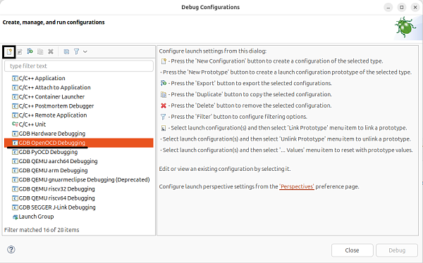В открывшемся окне слева необходимо выбрать пункт "GDB OpenOCD Debugging" и нажать кнопку "New", как показано на рисунке 12.