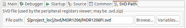 Во вкладке "SVD Path" необходимо указать путь к SVD-файлу, описывающему периферию МК, рисунок 16. SVD-файл также расположен локально в приложенных проектах, в папке svd, выбирается в зависимости от микросхемы, MDR1206FI.svd или MDR1206AFI.svd.