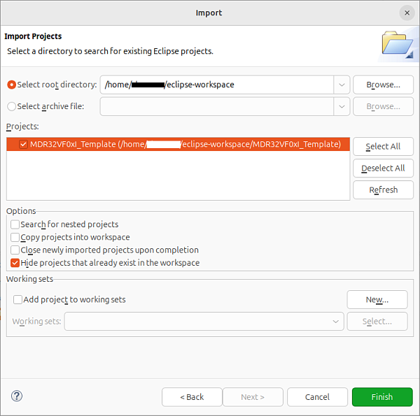 В пункте "Select root directory" необходимо указать папку с проектом "MDR32VF0xI_Template". В поле "Projects" установить галочку напротив выбранного проекта, а также установить пункт "Copy projects into workspace", чтобы проект был скопирован в workspace, если проект расположен не в папке workspace. Далее следует нажать "Finish". При появлении окна "Overwrite '.settings' in folder ..." - нажать "Not To All".