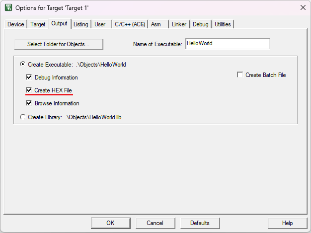 Во вкладке 'Output' можно активировать опцию - Create HEX file, которая добавляет после сборки проекта генерирование выходного образа прошивки в формате Intel HEX. Также можно изменить название исполняемого файла в поле 'Name of Executable'.