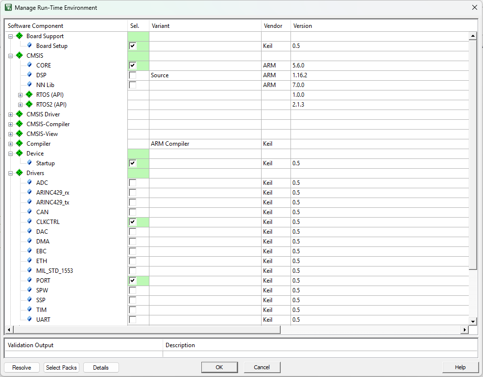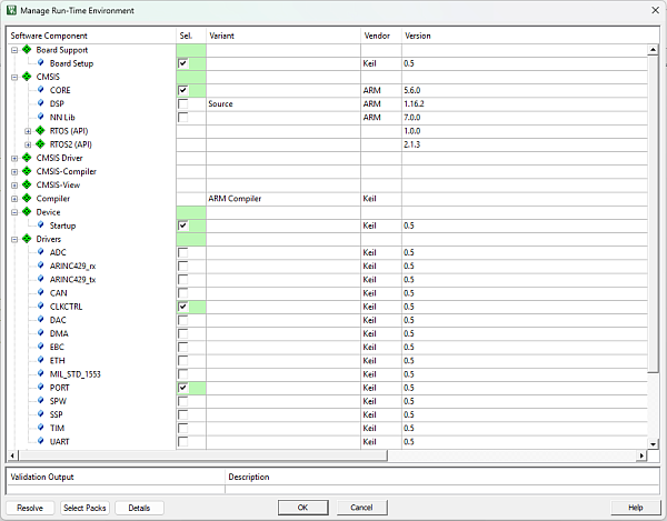 Следующий этап - подключение к проекту драйверов ядра, периферийных блоков и отладочной платы, меню 'Project - Manage - Run-Time Environment...'. Например, для проекта 'led_button_exti' из состава Software Pack потребуются: Board Support, CMSIS-CORE, Device-Startup и Drivers-CLKCTRL,PORT.