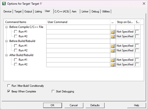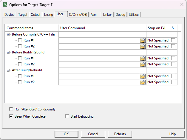 Во вкладке 'User' можно задать различные скрипты, которые будут выполняться автоматически перед компиляцией проекта, перед сборкой (Before Build/Rebuild) и после сборки (After Build/Rebuild).