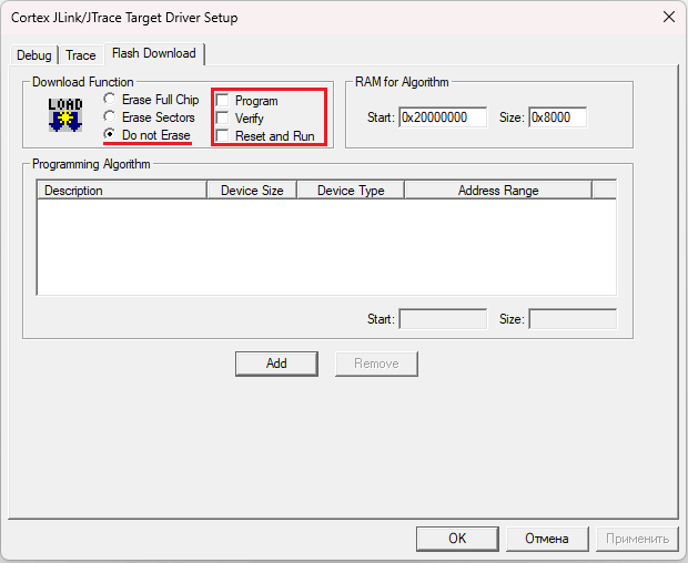 Во вкладке 'Flash Download' выбираются опции программирования (стирание, программирование, верификация). Поскольку прошивка загружается во внутреннюю ОЗУ, то программирование выполнять не нужно, и все опции выключены.