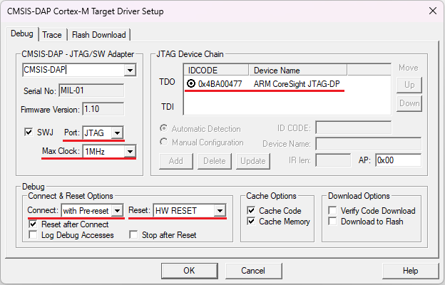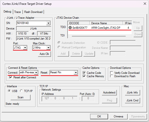 В группе 'Connect & Reset Options' рекомендуется установить подключение с предварительным сбросом, при этом сам сброс необходимо выбрать по выводу RESET микроконтроллера. Для разных программаторов данные настройки немного отличаются, ниже приведены примеры для J-Link и ULINK2/CMSIS-DAP.