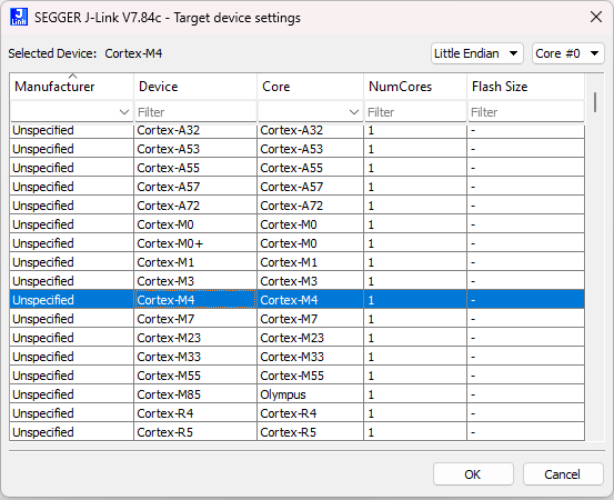 При первом запуске 'Settings' программатора J-Link открывается окно Target device settings. Поскольку J-Link официально не поддерживает микроконтроллеры Миландр, то необходимо выбрать аналог с корректным указанием ядра из списка и нажать ОК.