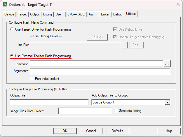 Во вкладке 'Utilities' необходимо выбрать 'Use External Tool for Flash Programming', чтобы выключить программирование.