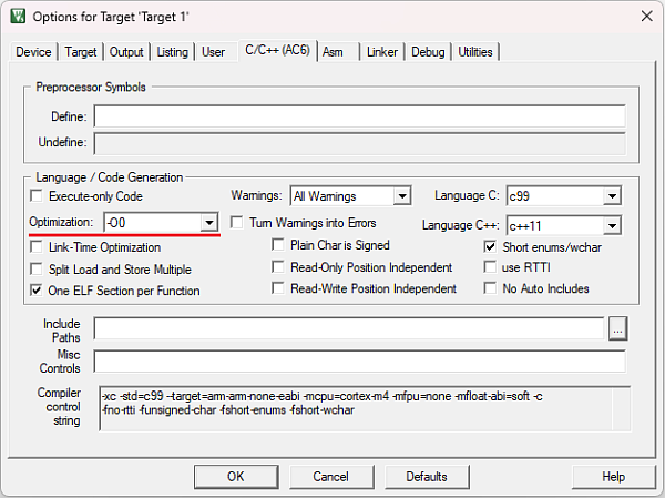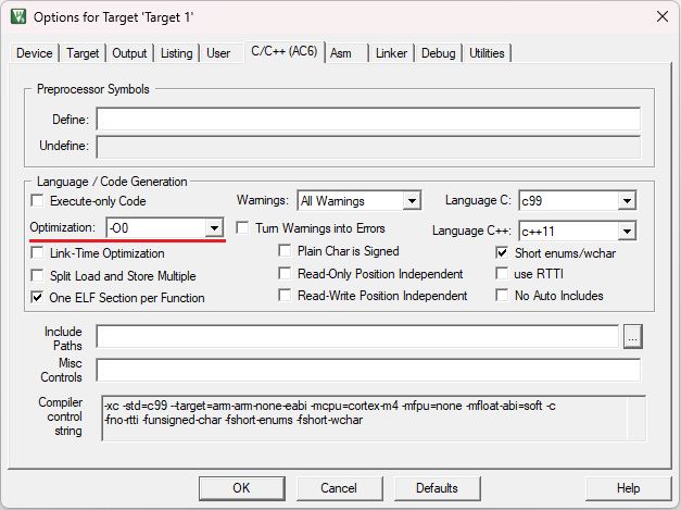 При разработке и отладке программ рекомендуется выключать оптимизацию - "-O0". При высоком уровне оптимизации получается более компактный и быстрый код, но из-за применяемых оптимизаций его сложнее отлаживать. Повышение уровня оптимизации лучше оставить до полного окончания разработки и отладки программы.