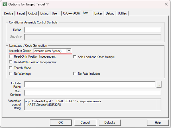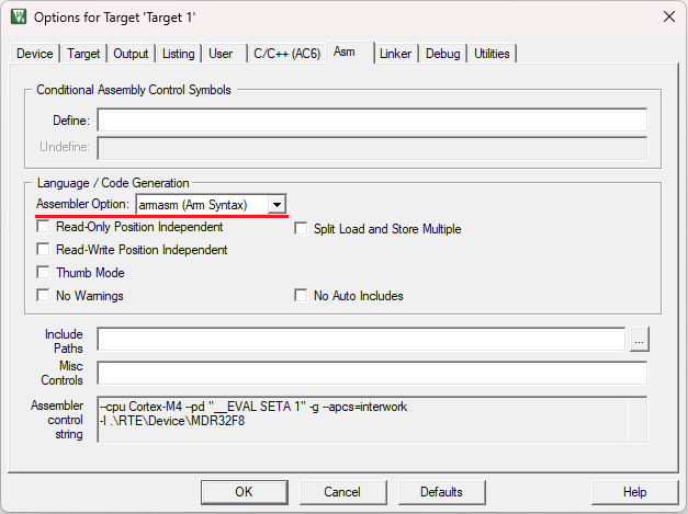 Во вкладке 'Asm' приведены настройки ассемблера. При работе с ARM Compiler v6 рекомендуется выбирать автоопределение ассемблера - поле 'Assembler Option', значение 'armclang (Auto Select)'. Иначе может быть выведено предупреждение [i] Warning A1950W (armasm is deprecated) после перехода на новую версию Keil 5.42.0.0.