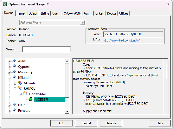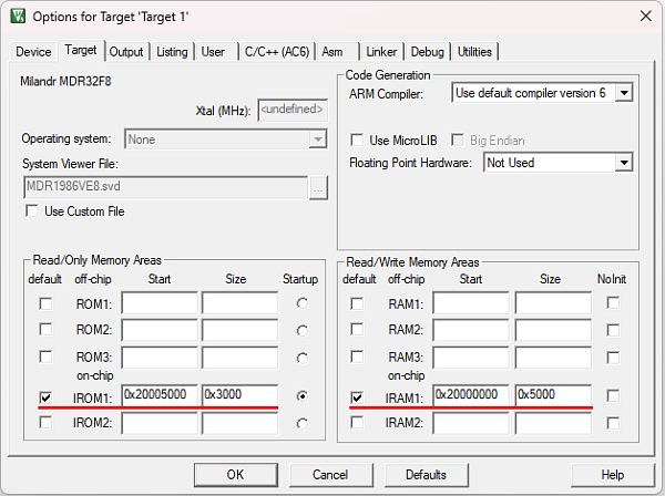 [i] Настройки проекта IDE Keil для МК К1986ВЕ8Т (RAM)