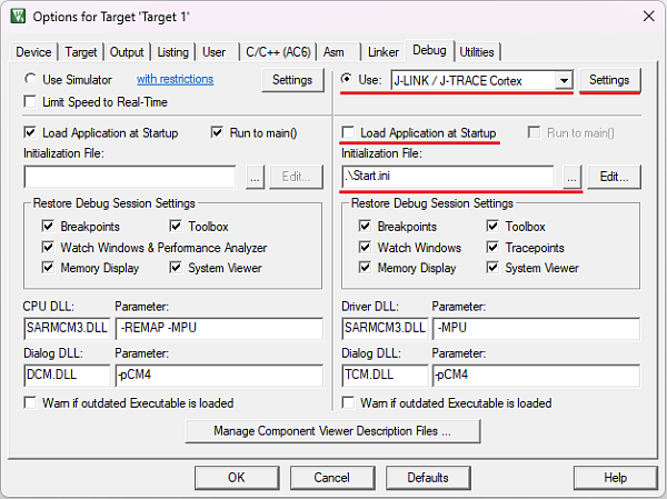 Во вкладке 'Debug' необходимо подключить файл инициализации Start.ini, чтобы при старте отладки Keil запустил выполнение программы из внутренней ОЗУ.