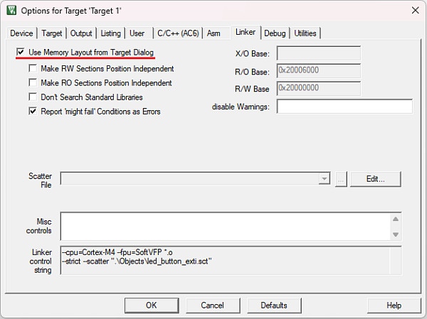 Во вкладке 'Linker' необходимо установить опцию 'Use Memory Layout from Target Dialog', чтобы Keil автоматически генерировал scatter-файл на основе описания областей IROMx/IRAMx из вкладки 'Target'.
