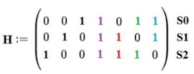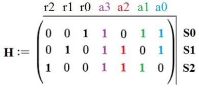 Для расчёта синдрома S[2:0], аналогично матрицы генерации G, вводят проверочную матрицу H. Синдром формируется путём перемножения считанного слова X и транспонированной проверочной матрицы HT, формула (5).