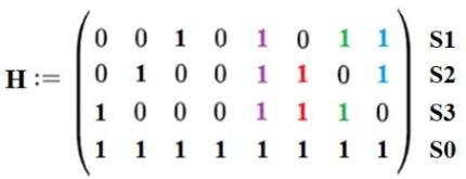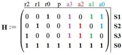 Если поменять местами строки 1 и 3, то получим проверочную матрицу, указанную в спецификации, при этом изменится порядок следования бит синдрома S = {S0, S1, S2} (рисунок 5).
