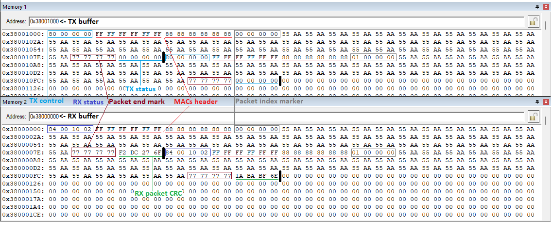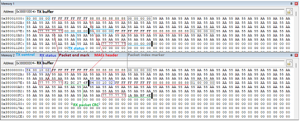 Передатчик в первые 4 байта Payload (см. статью "[i] Начальные сведения о Ethernet") записывает индекс кадра. В последние 4 байта записывается "индикатор" конца данных (0x7777_7777). При анализе данных в памяти (в линейном и автоматическом режиме работы буферов) это позволяет видеть, где заканчиваются данные и начинается статус передачи (в памяти передатчика) или слово CRC (в памяти приемника).
