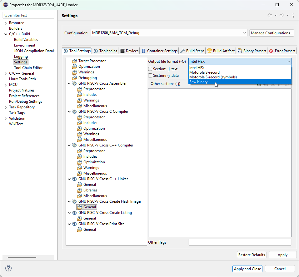 Для микросхем с ядрами архитектуры RISC-V получение bin-файла в среде Eclipse сводится к изменению настроек проекта и повторной сборке проекта.