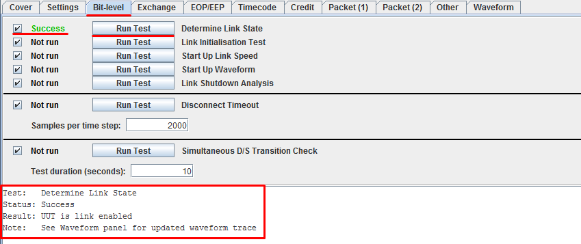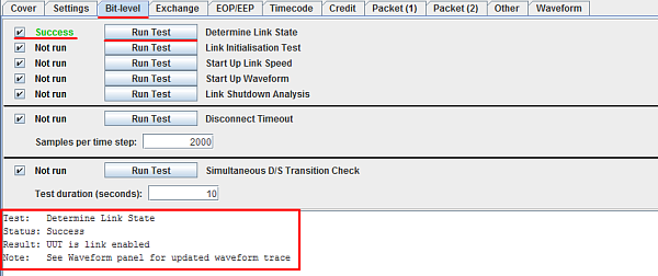 - Тест "Determine Link State", то есть тест определения состояния линии. Тест всегда проходится успешно. В рассматриваемом случае результатом теста является то, что SpaceWire устройство включено (UUT is link enabled).