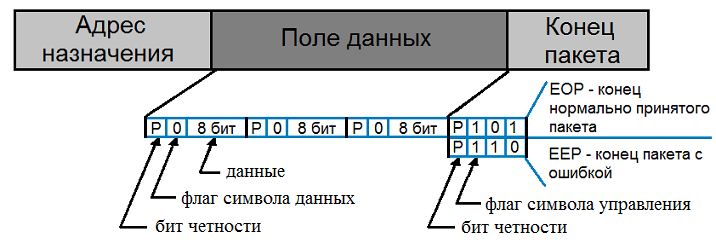 Пакет SpaceWire включает поле адреса назначения, поле с данными пользователя и маркер конца пакета. Формат пакета с адресом места назначения ориентирован на передачу пакета через сеть из маршрутизаторов. В нашем случае пакет передается между двумя абонентами (ПК-МК), связанными прямым каналом (точка-точка), поэтому поле адреса назначения не используется и формирование пакета начинается сразу с поля данных. Поле данных состоит из символов данных по 10 бит, из которых полезные 8 бит данных при приёме передаются в буфер FIFO. Конец пакета обозначается символом управления EOP или EEP. Графически пакет SpaceWire представлен на рисунке 2.