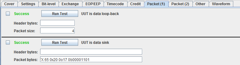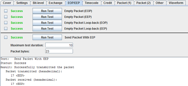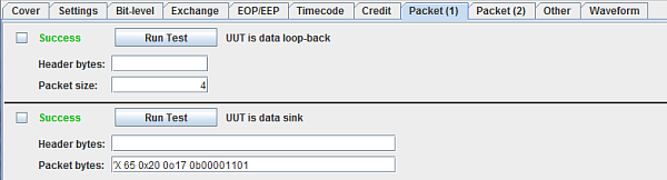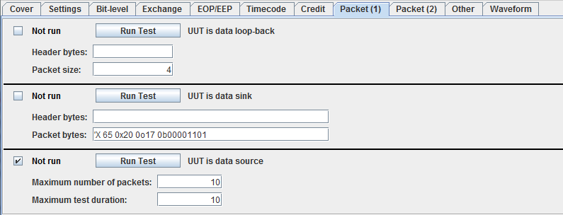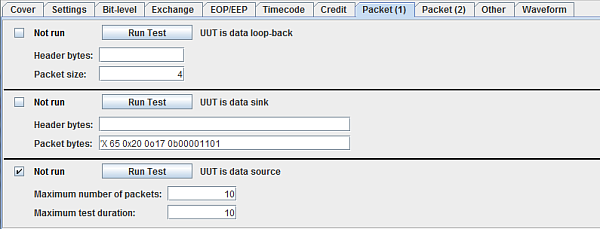 - Тест "UUT is data sink" позволяет отправить пакет с данными, введенными в поле "Packet bytes". Проверяется приём пакета.