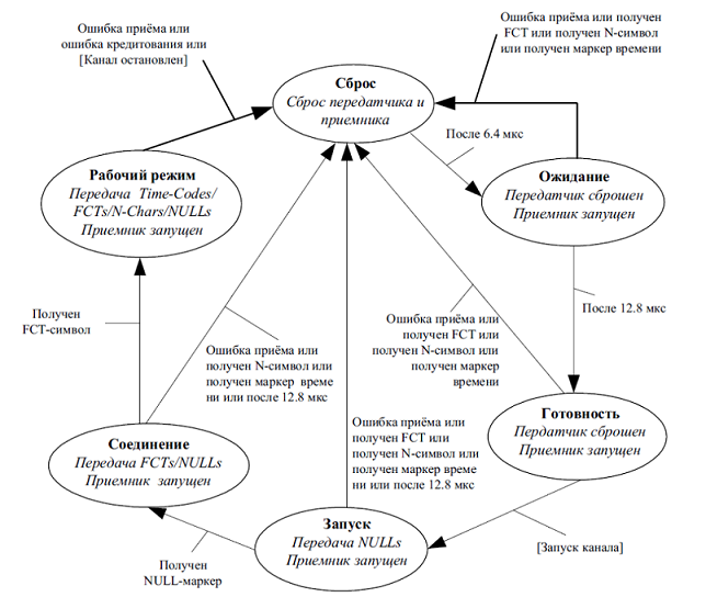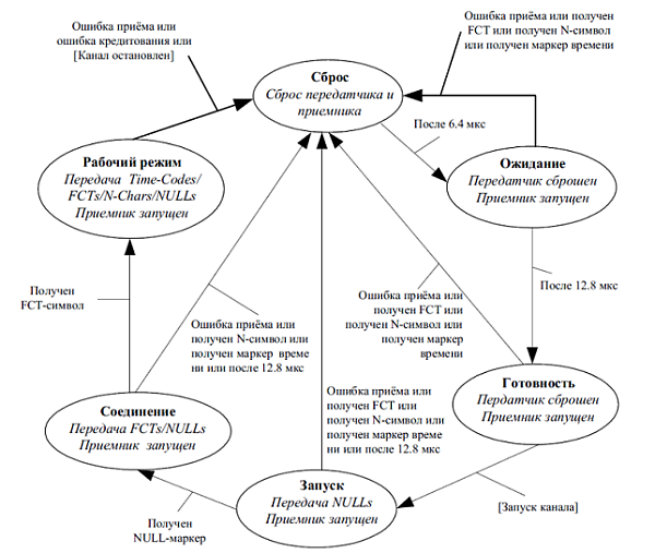 Учитывая суровые условия и сложную помеховую обстановку на борту космических аппаратов и аналогичных систем, на которые ориентирован стандарт SpaceWire, разрыв и последующее автоматическое восстановление соединения является штатной ситуацией, обрабатываемой автоматом контроллера SpaceWire, который представлен на рисунке 3.