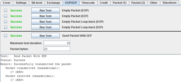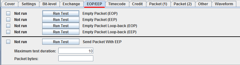 Если все тесты пройдены успешно, то далее нужно перейти во вкладку EOP/EEP. Здесь на тестовом стенде будут выполнены первые 5 тестов, определяющих корректный приём и передачу пустых пакетов. Вид вкладки EOP/EEP показан на рисунке 10.