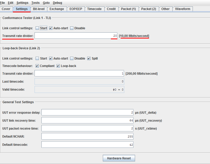 Здесь необходимо установить только скорость передачи данных от тестера в микроконтроллер. Остальные настройки трогать не нужно, они сейчас не важны. По умолчанию скорость передачи данных от тестера установлена 200 Мбит/с. Вводя в поле "Transmit rate divider" делитель скорости, можно уменьшить её до корректного значения. Скорость передачи данных, то есть скорость приёма для микроконтроллера, может задаваться в зависимости от частоты тактирования блока SpaceWire в микроконтроллере. Скорость приёма в микроконтроллере задаётся внешним передатчиком и не должна превышать частоту тактирования блока SpaceWire более чем в 2 раза. В рассматриваемом случае частота тактирования 60 МГц, поэтому максимально возможная скорость приёма данных микроконтроллером равна 120 Мбит/с. В программе ConformanceTester необходимо ввести делитель, задав допустимую скорость передачи.