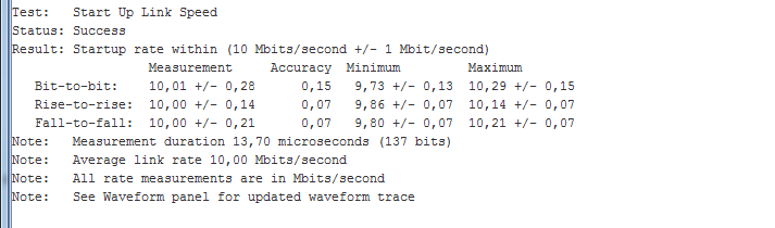 - Тест "Start Up Link Speed" проверяет, что начальная скорость передачи сигналов от тестируемого устройства составляет 10 ± 1 Мбит. В окошке внизу выводится результат измерения скорости. Иногда для прохождения теста требуется дополнительно немного варьировать значение для задержки в 6.4 мкс в регистре MDR_SPWx→PAUSE. В рассматриваемом случае результат получился таким, как на рисунке 6.