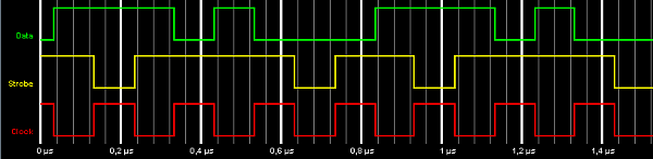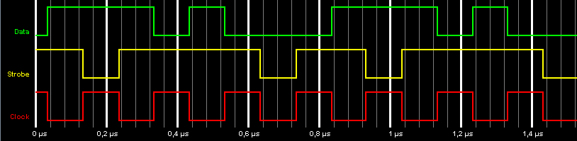 Линия D повторяет значение бита данных, то есть имеет высокий потенциал для бита логической "1" и низкий потенциал для логического "0". Линия S изменяет свое состояние каждый раз, когда состояние линии D остается неизменным для следующего бита.