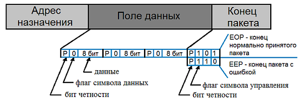 Битовый поток состоит из символов данных и управления. Тип символа определяется в зависимости от значения флага данные/управление. Из символов данных и управления собирается пакет SpaceWire.