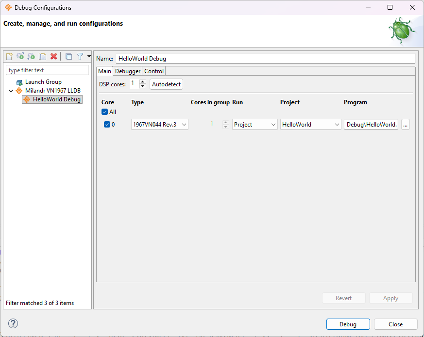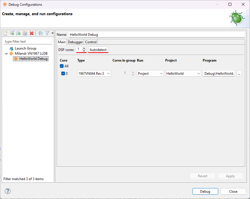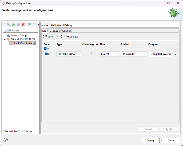 Будет создана конфигурация с именем HelloWorld Debug. В поле "DSP cores" указывается количество процессоров, объединенных в JTAG цепочку. На отладочной плате один процессор К1967ВН044, поэтому выбираем "DSP cores = 1". Настройка параметров приведена на рисунке 13.