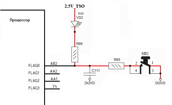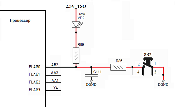 Светодиод подключен к питанию 2.5 В. Чтобы его зажечь, необходимо замкнуть цепь, нажав на кнопку и соединив светодиод с землей. То же самое происходит, когда FLAG0 настраивается на выход и подается логический "0", то есть соединяется выход вывода с землей. Чтобы погасить светодиод, нужно переключить вывод FLAG0 на вход. Управление состоянием FLAG0-FLAG3 осуществляется через системный регистр FLAGREG.