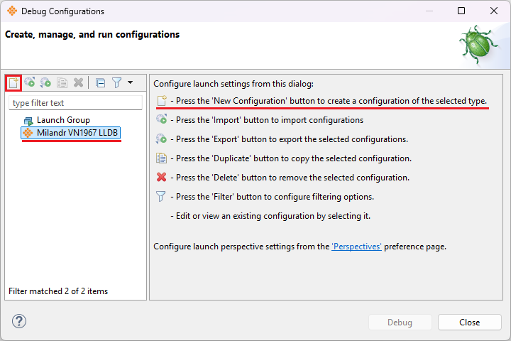В открывшемся окне слева необходимо выбрать параметр "Milandr VN1967 LLDB" и нажать на кнопку "New". Показано на рисунке 12.