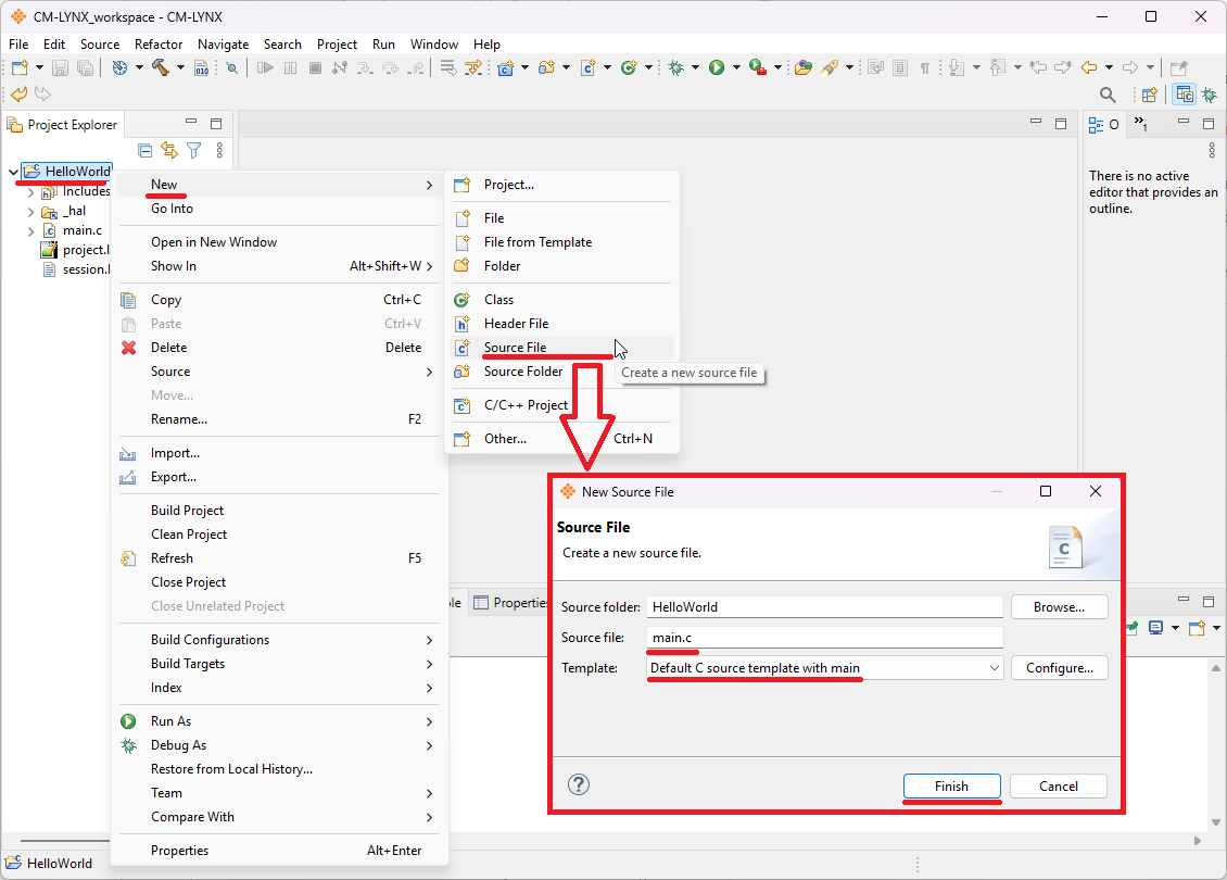 Если на этапе 6 файл main не создавался, его можно создать вручную. Для этого нужно (см. рисунок 5): нажать правой кнопкой мыши (ПКМ) по проекту, далее New → Source File. В открывшемся окне ввести название файла (обязательно с расширением), выбрать шаблон и нажать Finish.